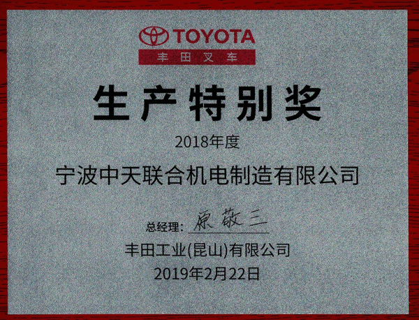中天聯(lián)合機(jī)電喜獲豐田工業(yè)(昆山)有限公司生產(chǎn)特別獎
